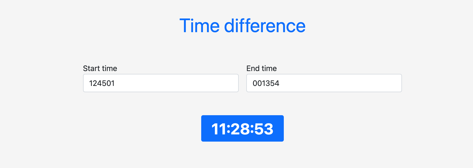23:59:59. endcan be smaller thanstart: in such case, it means that you need to compute the time difference from the previous day at the timestartto the next day at the timeend.- If the user input is invalid (for example, minutes greater than 59), you should return